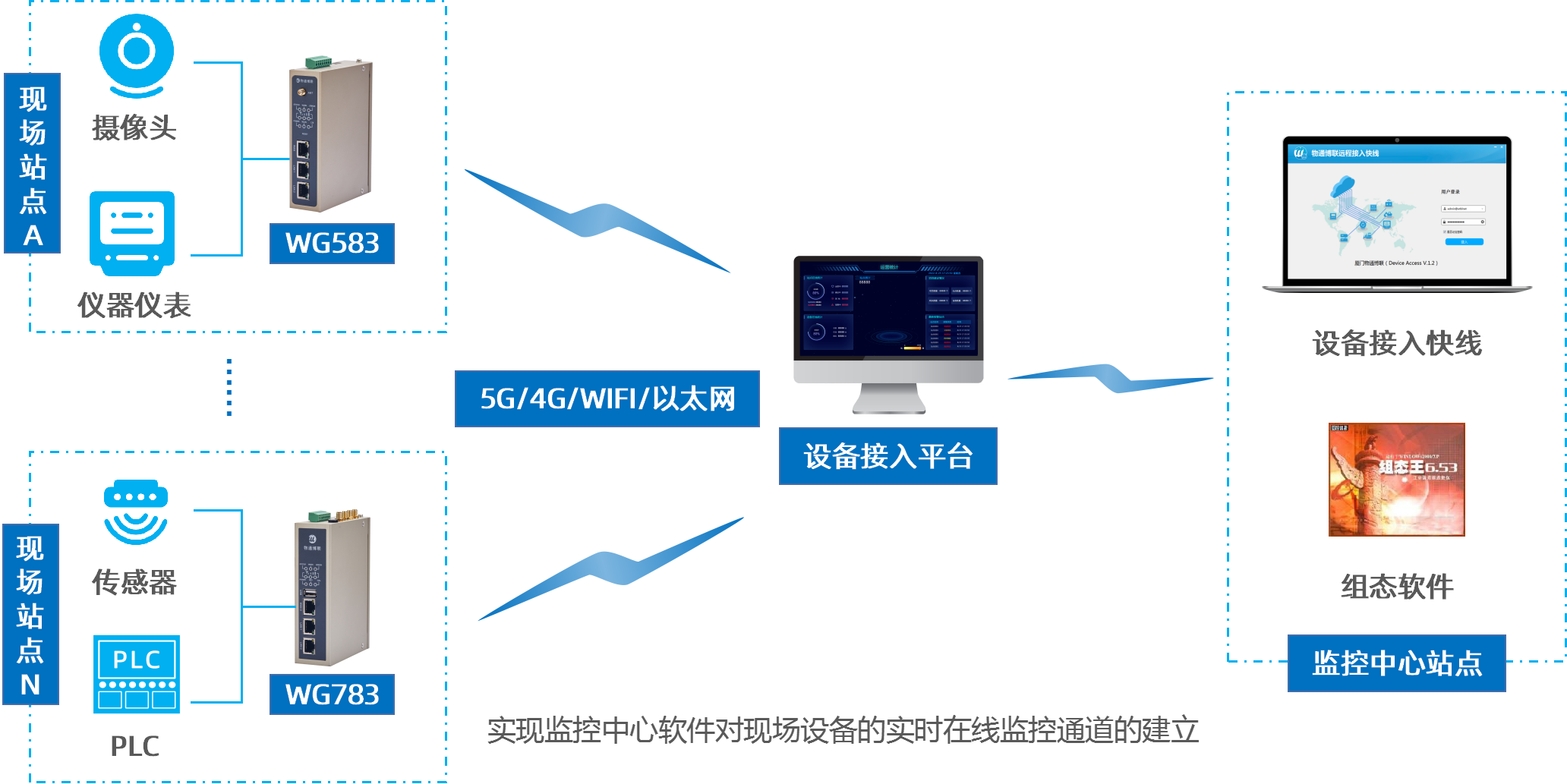 广泛应用于工业组态软件与分布式现场设备实时监控,分布式设备的点对点及点对多点通信等数据透传通道的便捷式、大容量、高可靠、低成本搭建场景。