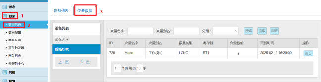 数采配置(设备信息+变量参数)完成后,重启采集程序并生效配置即可在:数采信息---变量数据---设备名称 中看到采集上来的数据。