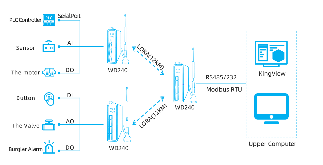 Example WD240-LM0844-485 (8AI-4DI-4DO, domestic frequency band: 410~493MHz, 485 serial port)