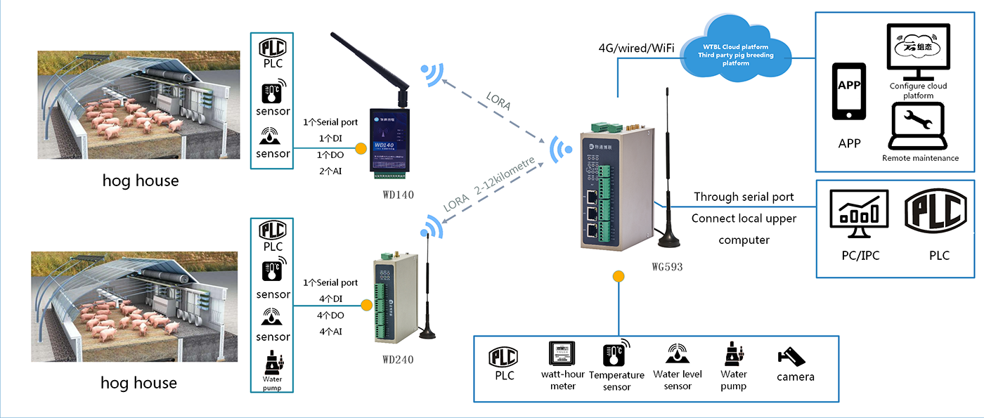 The intelligent breeding scheme of WideIOT is to connect the LORA data acquisition terminal WD140 or WD240 with the temperature and humidity sensors, PLC and other devices at the pig farm site, and transmit the data to the corresponding node's WideIOT Industrial Union intelligent gateway via LORA wireless to obtain the data of the temperature and humidity sensors and PLC at the site for real-time monitoring. At the same time, the data can be transmitted to the WideIOT data cloud platform or a third-party platform through the various equipment networking modes of the gateway to monitor the operation of the entire farm. At the same time, engineers can monitor the process flow of the on-site PLC through the IOT Bolian equipment express, and PLC remote configuration, diagnosis, and upload and download programs.