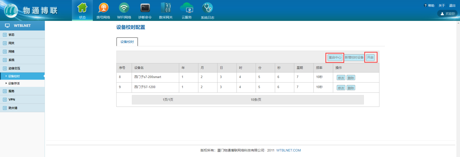 点击“开启”按钮(注意:当该设备校时功能处于关闭状态时,该按钮显示开启,反之显示关闭);点击“重启中心”按钮,等待提示成功,使配置生效。
