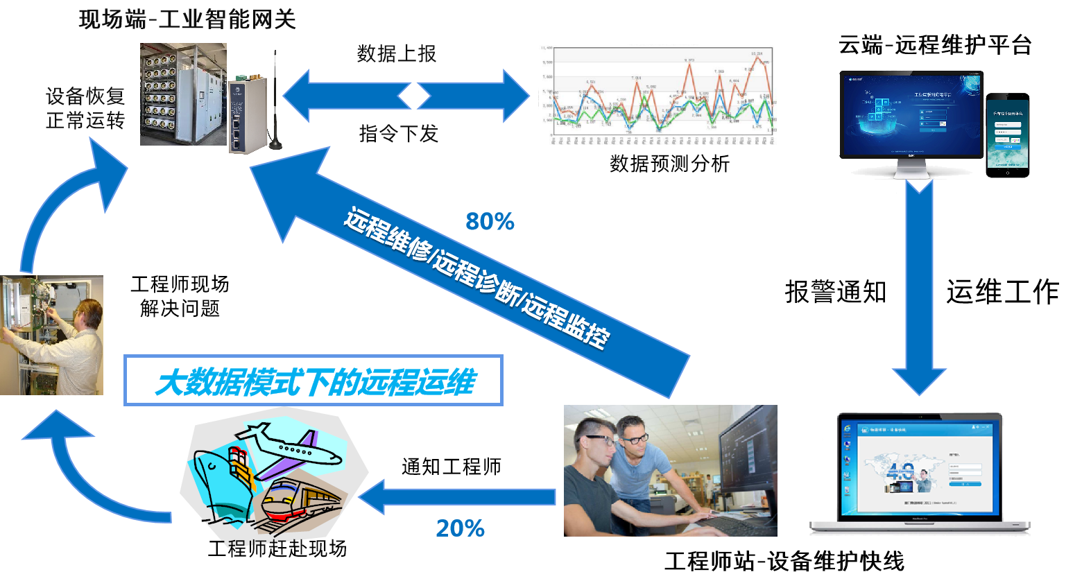 设备远程维护系统 777盛世国际设备远程维护系统由现场端的工业智能网关、工程师站的设备维护快线、云端的设备远程运营管理平台三部分组成,构建了一条通往远端工业现场的远程维护的安全数据通道,实现工程师对设备远程维护、诊断、调试和远程上下载程序,极大降低工程师出差成本,提高工程师的工作效率,实现了预防式远程维护及管理。
