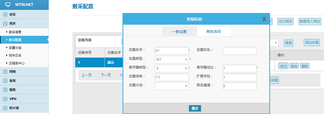 变量配置主要是定义变量名(自定义内容,不可使用中文命名)、变量别名(自定义,可使用中文名字)、寄存器类型和寄存器偏移地址,并定义一些数据规则(如:倍率、小数点、单位、告警)。