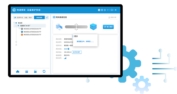 Using the equipment maintenance express line of WideIOT, after logging in through the account, finding the corresponding gateway to establish a maintenance channel, you can build a network port channel and a serial port channel leading to the equipment site, so that engineers can go to the site without traveling remotely. Realize remote maintenance anytime, anywhere.