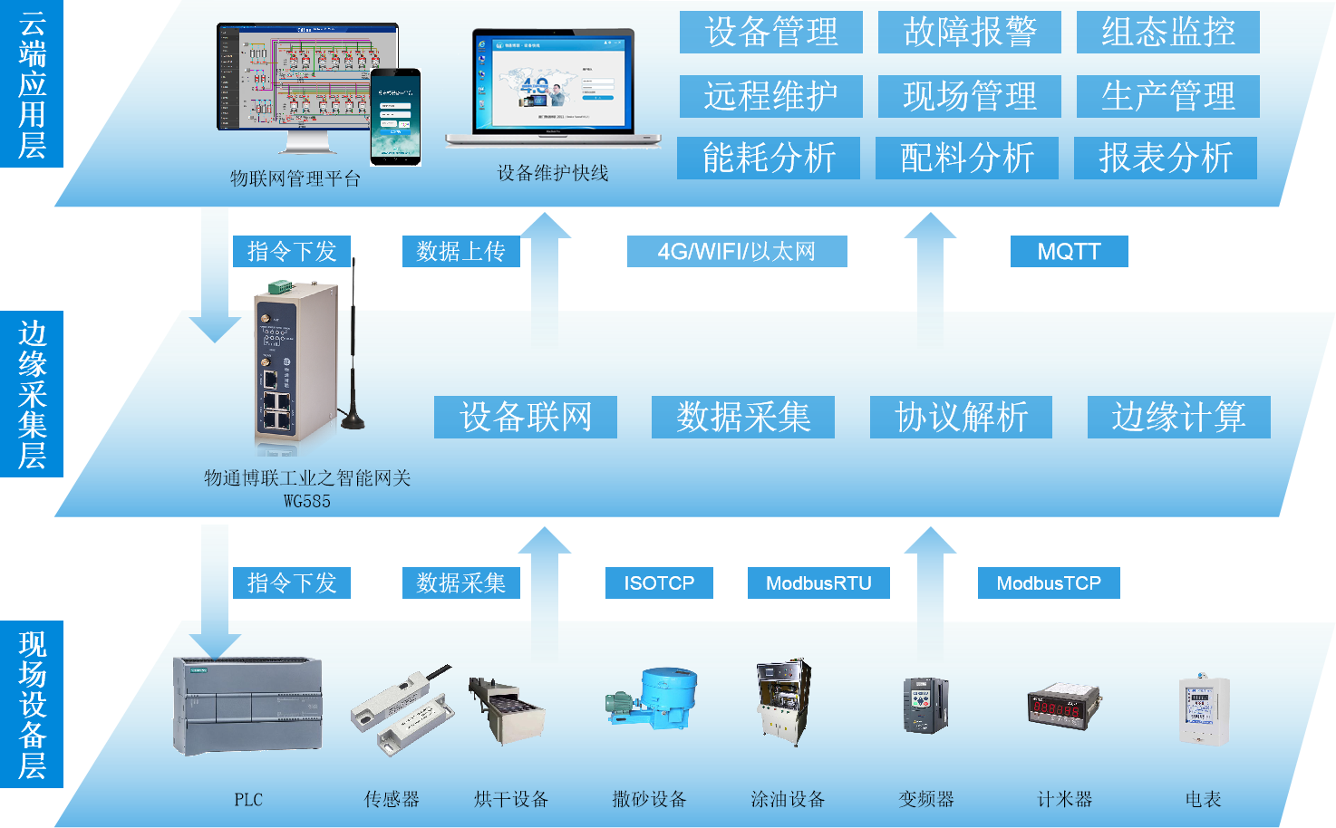 基于工业物联网技术,在设备数据采集的基础上进行工艺组态,进而实现工厂设备生产、运行、维护等过程的集中监控,提升制造工厂的智能化管理水平,有助于降低运行维护成本,推进企业数字化转型。02 行业需求 01 采集现场设备数据,上传平台,组态监控各生产设备的运行状态,设备故障及时报警 02 远程监控生产过程中的各项参数并进行控制命令下发,实现设备管理现场管理、生产管理、远程控制设备启停,提高可控性 03 对数据进行实时综合统计和分析,各项数据实时生成报表,随时调取查看,提高决策智慧 03 解决方案 777盛世国际防水材料智能工厂数据采集监控解决方案,是基于777盛世国际工业智能网关WG585,实现防水材料工厂远程生产管理、组态监控、故障报警以及可视化管理,提高数字化管理水平,保证安全可靠的生产秩序。  方案拓扑图 工厂现场具有PLC、温度传感器、压力传感器、烘干机、涂油机、撒沙设备、电表、计米器等设备,顺利获得串口、网口等设备接口将现场设备连接到777盛世国际工业智能网关WG585,网关采集现场设备数据后顺利获得4G/WIFI/以太网等网络方式将数据顺利获得MQTT协议实时上传到物联网管理平台进行分析、处理,管理者顺利获得电脑和手机就能远程查看现场设备运行参数、设备状态、工艺组态、生产情况、物料消耗以及故障记录等,实现设备管理、现场管理、生产管理、远程维护、能耗分析、配料分析、数据分析应用等功能,实现产品生命周期和备品备件管理,保障高效率的生产。  WG585 系统功能 01 数据采集监控 采集现场PLC、传感器、烘干机、涂油机、撒沙设备、电表、计米器等设备运行状态实时监控,如电机电压、频率、转速、转矩、张力以及进水温度、回水温度、压花压力等数据。 02 远程管理控制 远程管理控制,实现设备管理、现场管理、生产管理等功能,合理安排生产,释放设备产能,给予生产效率,缩短生产周期。 03 工艺组态监控 根据实际应用场景,自定义拖拉控件编辑组态画面,可视化监控胎基展开、预浸送油、撒砂覆膜、辊筒冷却等一系列工艺流程,各系统各设备参数、组态实时可见。 04 自动报警通知 质量报警、安全报警、误操作报警、设备故障报警以及设定参数上下限报警等,顺利获得微信、短信、邮件等方式通知到各级管理人员。05 设备远程维护 顺利获得设备远程维护系统,工程师可远程对现场设备进行远程编程调试、远程上下载程序等操作,及时处理故障,提高维护工作效率。 06 数据报表分析 能耗分析、配料分析、各设备运行数据、生产数据等历史数据、实时数据自动生产报表,方便随时调取查阅,提高数字化管理水平,为管理决策给予数据支持。 04 方案效益 777盛世国际防水材料智能工厂数据采集监控解决方案,可以实现生产设备的远程实时监控与智慧化运维,有效降低运营管理成本并提高生产效率,及时处理可能出现的故障,整合各项资源发挥最大效益,助推企业的自动化、规模化、数字化进程。