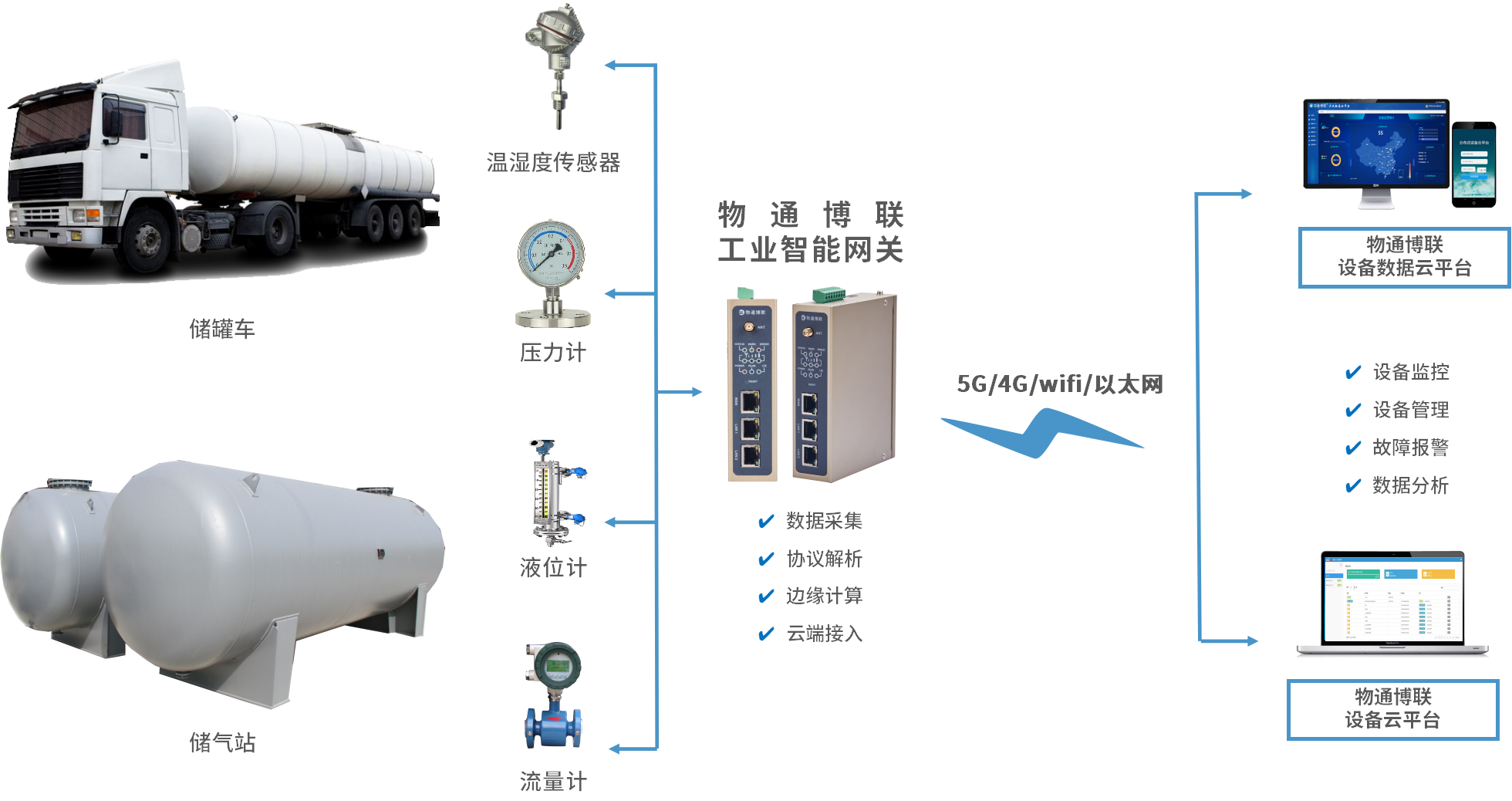 777盛世国际工业网关采集温度传感器、压力计、液位计、流量计等设备数据并以5G/4G/WIFI/以太网等方式上传到设备远程运维管理平台。顺利获得云平台实现对液位、压力、温度、流量等数据的在线监测,并实现设备运行监控、远程管理、故障报警等功能,进而判断燃气输配设备的工作状态,保证燃气输配设备的安全稳定运行,有力支持燃气输配的安全管理工作。