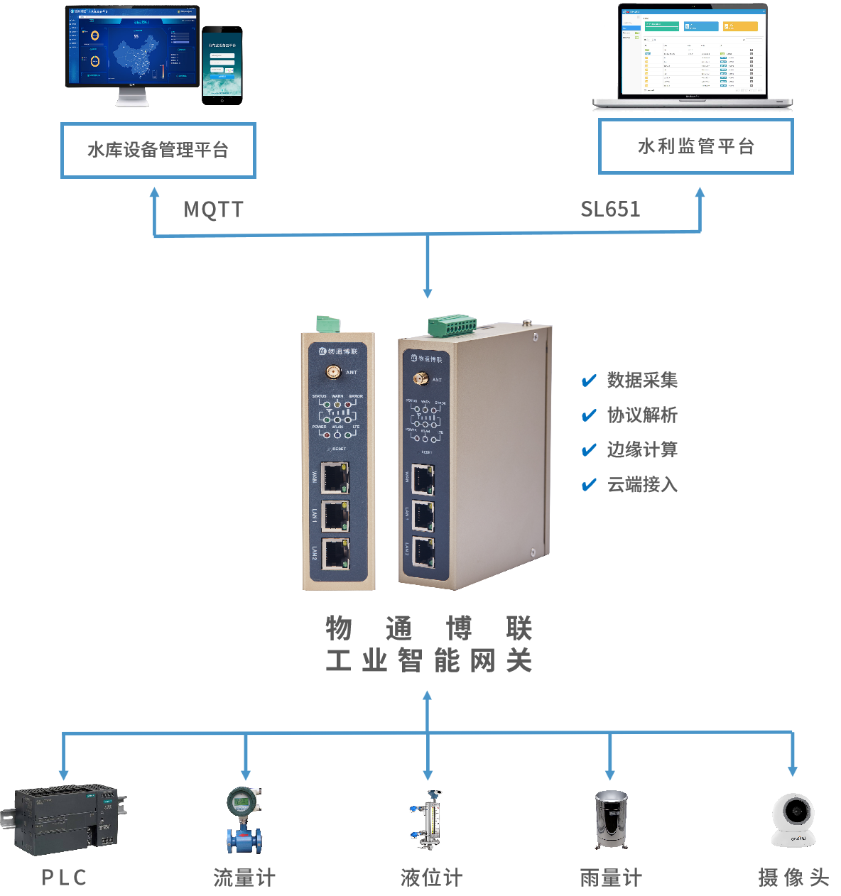 777盛世国际工业智能网关可以接入水库现场的流量计、水位计、雨量计、摄像头等设备,采集流量、水位、雨量、现场图像/视频等数据并顺利获得5G/4G/WIFI等无线网络进行实时通信,以SL651协议和MQTT协议传输到水库管理平台和县、市、省、国家等多级水利管理部门的监控中心,及时分析到水库的运行状态,进而实现数据的智能分析与应用,更好的支持水库管理与防洪防灾工作。
