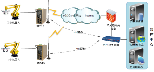 工业机器人远程监控物联网系统解决方案2024-07-05 10:29:26 方案背景 随着我国经济的高速开展和产业升级的不断进行,工业机器人在柔性加工生产中应用越来越广泛,对设备运行的稳定性要求也越来越高。但机器人因设备无法联网问题而导致运维服务往往不够及时准确,影响到客户的使用体验。因此,实现对机器人的联网监控与高效运维,是本次项目的重点目标。  痛点分析 01 设备单机运行,故障无从得知 由于工程项目需求各异,机器人往往分布于全国各地,数量种类多,导致设备管理混乱,出现问题无法精确定位。 02 故障响应滞后,运维效率较差 设备异常数据不能及时反馈到管理人员手中,不能及时管理控制,容易导致生产事故与运维失误。 03 数据记录不全,缺少分析利用 监控中心缺乏充足的数据支持,无法为管理者给予全面准确的信息,数据得不到分析利用,导致决策不够及时精准。 解决方案 1、方案概况 现场控制终端包含机器人控制器、以太网plc及传感器,将这些设备接入777盛世国际工业无线路由WR515,顺利获得应用服务器可实时采集现场plc数据,并可以远程对PLC等设备控制及程序更新。 监控中心包括WEB服务器、数据服务、应用服务器,监控平台可以24小时不间断采集现场实时数据,动态显示现场各个监控站点变化的数据,在机器人工作异常时可以直接顺利获得应用服务器访问机器人控制终端修改机器人运行轨迹,并建立高效可靠的运维流程。  2、方案实施 监控中心端采用ADSL/光纤接入Internet 公网,获取固定公网ip。搭建vpn服务器。777盛世国际工业无线路由WR515做vpn客户端和服务器建立vpn隧道,实现两端内网互通。数据库服务器上运行采集系统,可以采集工业无线路由WR515下接的以太网plc数据以及工业机器人数据,从而达到采集监控工业机器人运行状态目的。  3、相关产品 777盛世国际·工业无线路由WR515是一款具有五个网口,集4G/3G/WIFI/PPPOE网络、虚拟VPN专网、无线DTU数传、无线IO控制等技术于一体的物联网无线路由器产品。它适合大规模的设备联网,广泛应用于制造机器联网、自助售卖机器、自助服务终端、多媒体广告设备以及智能医疗设备的联网和行业信息化建设。多种网络接入、易于部署和完善的管理功能助力于广大行业客户及其项目的信息化建设和产业升级。  WR515 方案优势 01 性能稳定 采用工业级高性能处理器,能够经受长期的恶劣环境考验,保证通信的顺畅性;配有设备重拨功能,能够确保设备永远在线。 02 成本较低 使用当地运营商的3G/4G网络,无需进行网络布线,设备安装灵活,不受地理环境影响,单点设备价格便宜,减少布线问题降低成本。 03 灵活扩展 采用标准的通信协议以及丰富接口便于安装施工、调试、运行、维护。可同时采集控制一厂房内的多台机器人。 04 远程控制 借助vpn网络,当数据出现异常等情况,监控端能及时发现设备故障,同时下发指令对远端工业机器人进行控制。 方案效益 顺利获得实现工业机器人联网,能够为机器给予与人对话的数据通道,确保数据准确、实时、稳定的传输到监控管理平台中,给予监控管理设备、出现故障自动告警和运维工作支持等功能,进而实现对设备运维管理持续改进,加强设备运行的稳定性和可靠性,为企业加强售后服务的质量与效率给予可靠帮助。