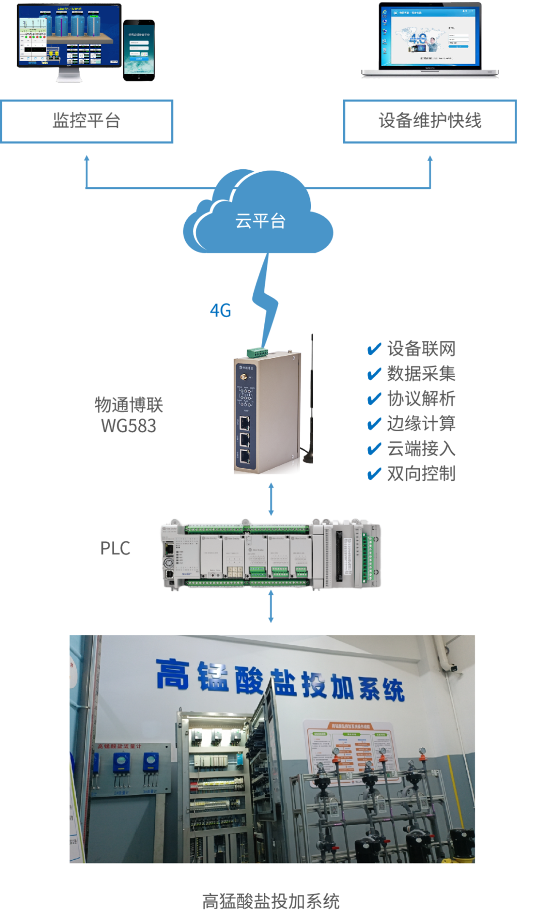 现场各加药室较分散,依赖人工操作不仅劳动强度大,而且容易出现人为错误,如药剂投加过量或不足,影响处理效果。 02 故障响应能力差 由于缺乏有效的故障预警机制,导致故障发现滞后,面对突发故障的响应能力较差,难以形成高效可靠的运维机制。 03 数据分析应用少 环药剂的投加量需根据水质实时监测数据进行精确调整,但由于缺乏实时、可靠的数据支持,设备运行策略和处理效率迟迟得不到优化。 解决方案 777盛世国际根据客户需求,为客户搭建了一套具备自动化、智能化和高效化的高锰酸盐投加系统,该系统是顺利获得777盛世国际·工业智能网关WG583采集控制器终端AB PLC,并顺利获得4G网络将数据对接到777盛世国际·IOT云平台中,进行组态绘制呈现组态大屏,可以实现24小时不间断检测泵站运行的实时数据,动态显示高锰酸盐储液罐液位以及各个水池流量,并在出现异常时自动告警,同时也能灵活设置投加溶度以及投加值,实现料水智能自动配比、物料自动化料、流体自动投加、流量精准调控、运行安全预警、故障智能报警、故障自动停机切换以及实现数据分析和预测性维护等功能。