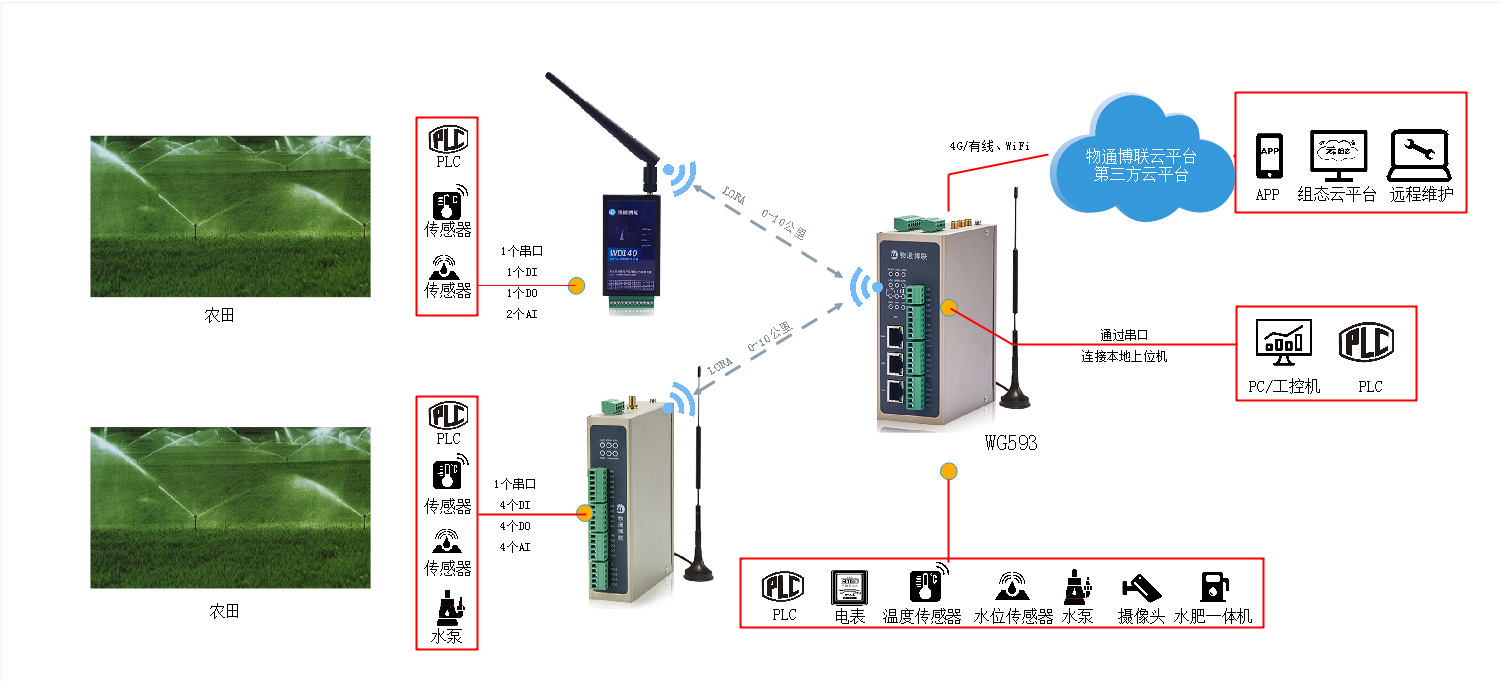 777盛世国际的水肥一体化方案是顺利获得LORA数采终端WD140或WD240与农田现场的温湿度传感器、PLC、水肥一体机等设备连接,同时可以顺利获得工业智能网关WG593获取数据,并顺利获得4G/WIFI等方式上网,MQTT方式上传数据,将数据传到777盛世国际数据云平台或第三方平台,云平台实时监控现场设备和水肥一体机的实时运行状态,实电脑端和手机端的远程监控和控制,监控整个农田的运行情况,科学合理的安排灌溉施肥计划,实现农田自动化灌溉与施肥。