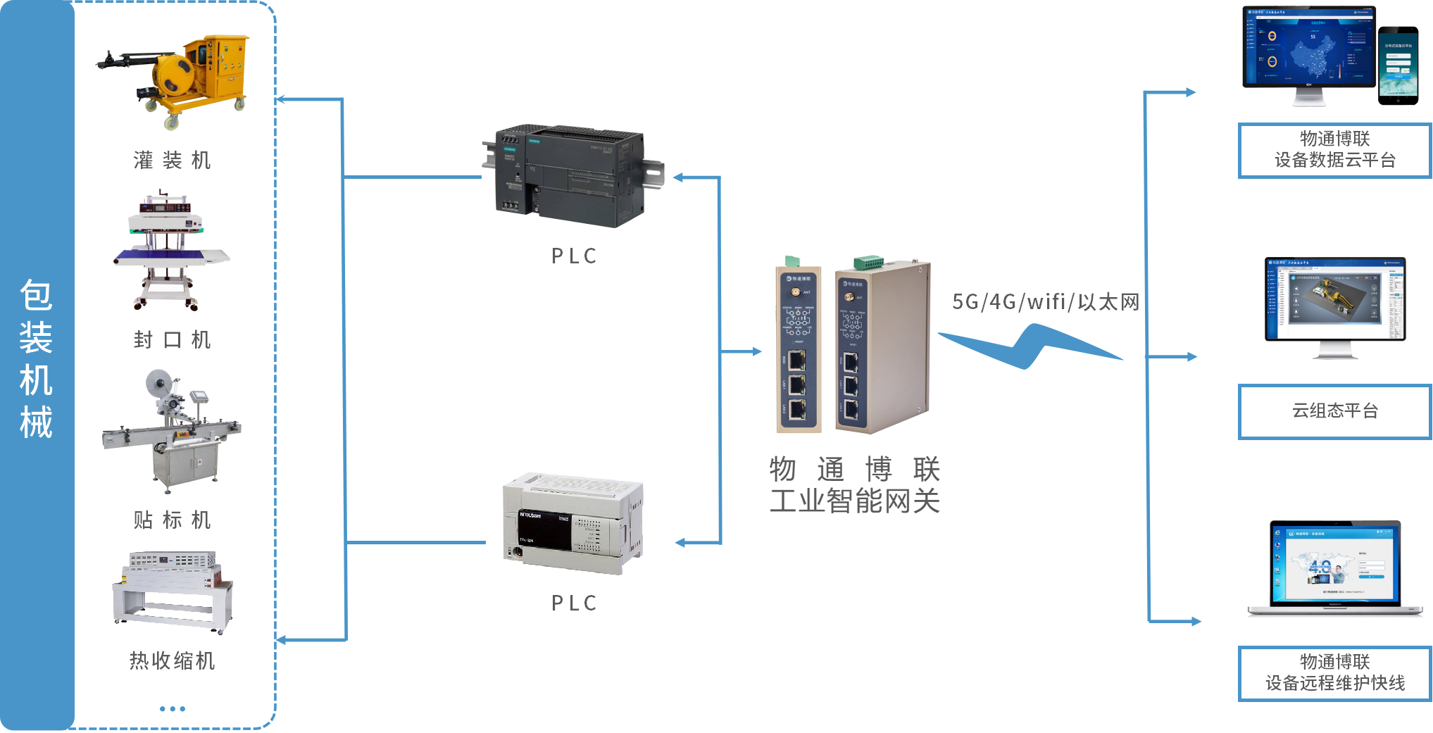777盛世国际工业智能网关具有丰富的通信协议和接口,顺利获得接入包装机械设备的控制器PLC,就能实时采集包装机械设备运行状态、温度、压力、振动等参数,顺利获得5G、4G、WIFI、以太网等方式将数据上传到云平台,实现远程监控、组态监控、设备管理、故障报警、远程控制、远程维护、数据分析等功能,全面掌握设备的运行情况,帮助企业提升包装机械设备运维与管理水平,保障安全稳定生产,提高生产效率。