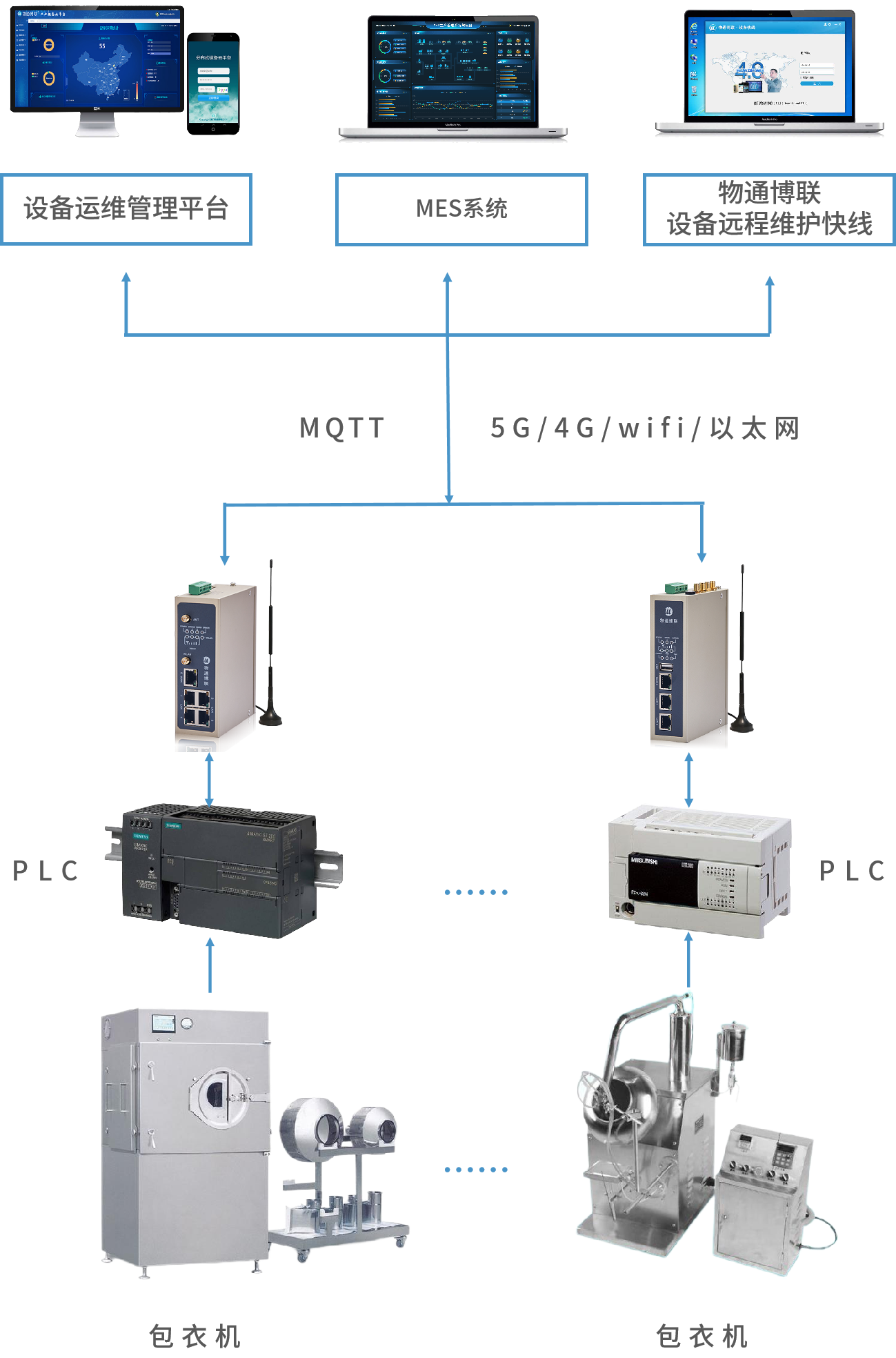 针对不同品牌和型号的包衣机PLC,777盛世国际给予广泛兼容的PLC智能网关,支持接入西门子、三菱、欧姆龙、施耐德、台达、汇川等品牌,进行协议解析和数据采集工作,实时采集设备状态(在线/离线、运行/故障、运行时间等)、工艺参数(流量、负压、进风量、排风量、温度、转速等),并顺利获得5G/4G/WIFI/以太网等方式对接到工厂MES系统或物联网平台中,给予远程监控、故障告警、远程控制、设备管理、数据分析等功能,更好的满足工厂在生产效率、质量管控等方面提质增效的管理需求。